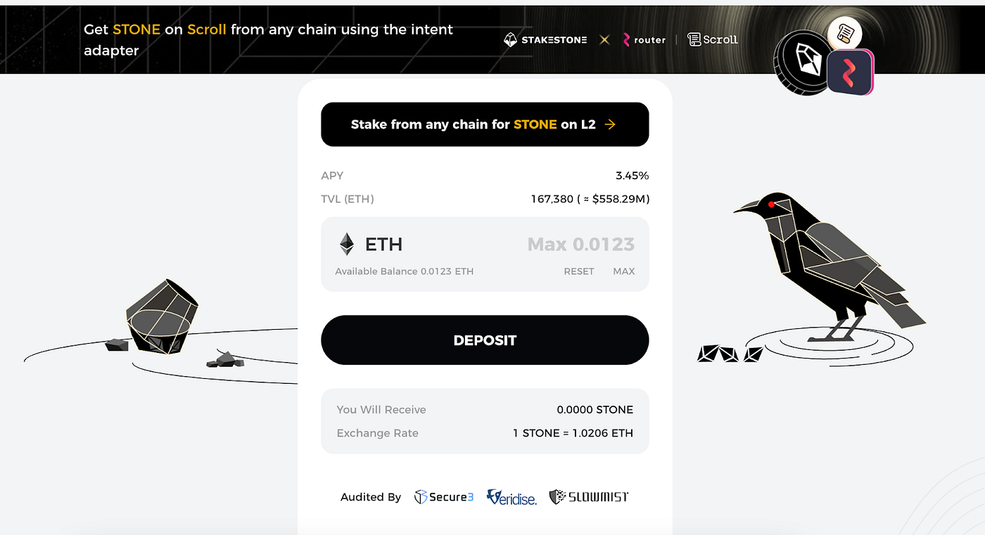 StakeStone 允许用户存入 ETH 并在以太坊上获取 STONE。STONE 是一种具有去中心化收益优化服务的收益型 ETH。StakeStone 的 TVL 超过 5.5 亿美元,STONE 是一种全链代币,这很有帮助,因为 STONE 旨在支持 Layer2 上的流动性。StakeStone 适配器与协议和平台无缝集成,提高了在 Scroll 上获取 STONE 的可访问性和效率,具有无与伦比的轻松性和速度。